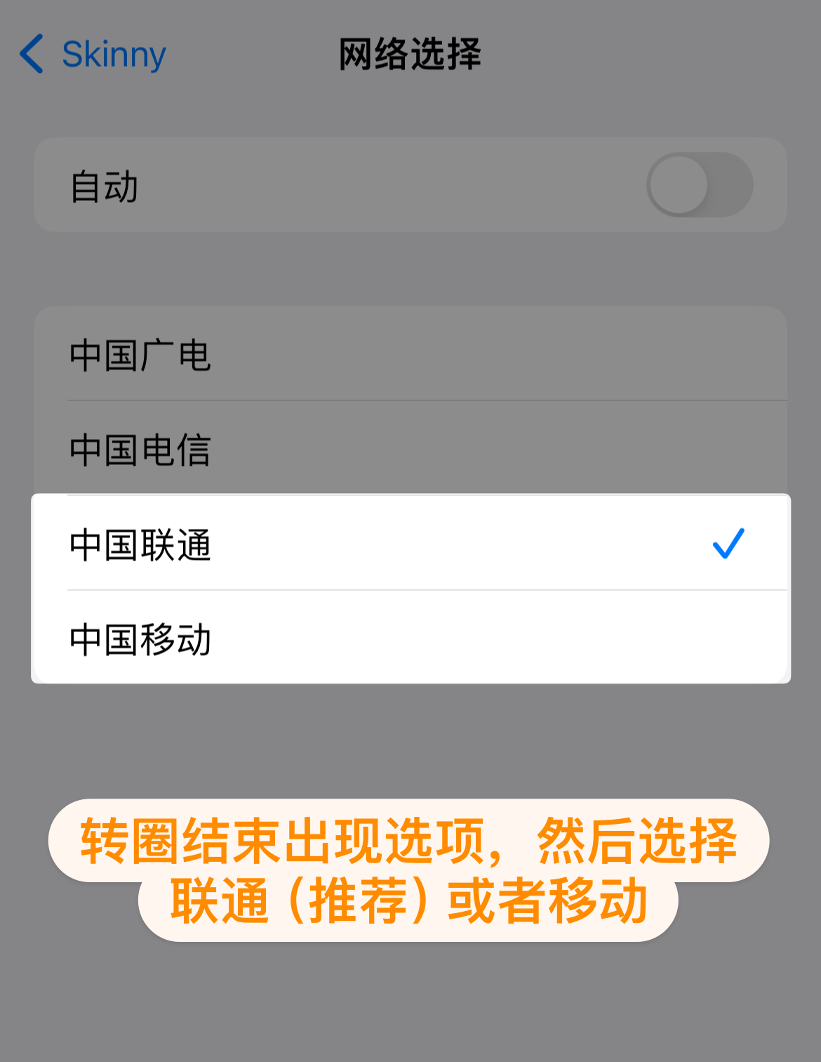 - 转圈结束出现选项,选择「联通」或者「移动」